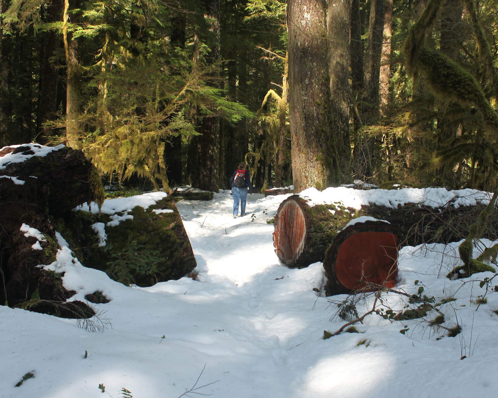 We parked our car at the Belknap Hot Springs Resort and headed up the trail. Within a few yards, we ran into snow at a mere 1500 ft of elevation. However, the snow was just inches deep and the trail was always visible. Also, mostly-always visible was the noisy McKenzie River, running deep and cold with the winter runoff.