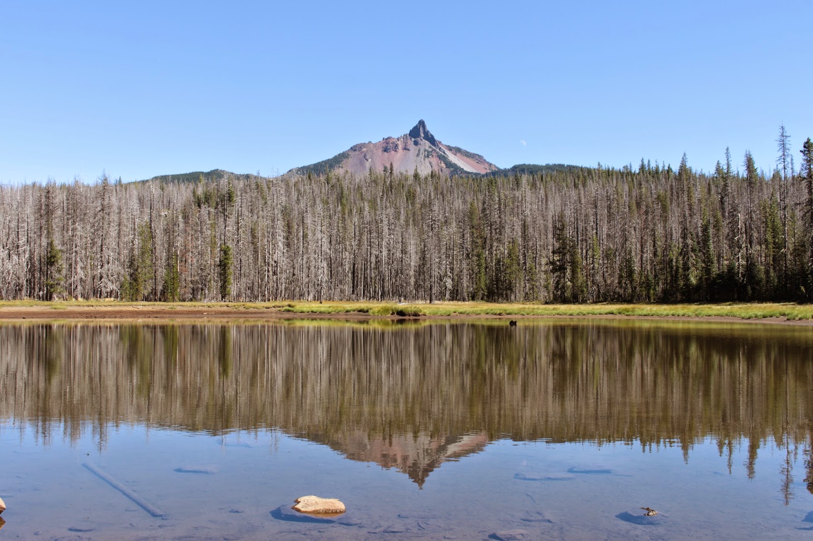There is a third Patjen Lake but the guidebook made it seem like it was more wet spot than lake so I called two out of three and headed back to the trailhead. It was a pleasant walk listening to the staccato tap-tap-tap of hammering woodpeckers and the soft sighing of the breeze sifting through dead branches as shadows lengthened in the afternoon. Despite all the fire carnage, the hike had been eminently beautiful.