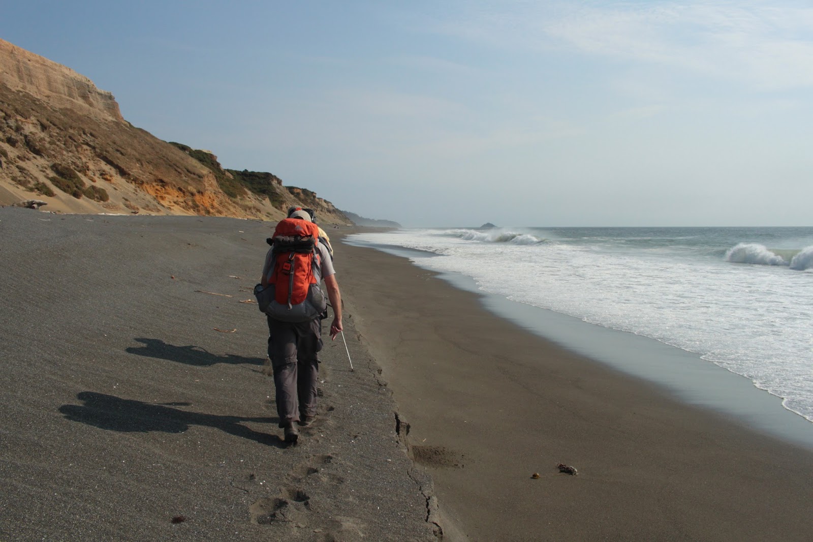 The second day dawned cold and foggy. While it wasn't raining, the air had that liquidity to it that left us all wet anyway. If anything, the sand had gotten softer than the day before. And just like the day before, the sand sloped steeply into the ocean while on the landward side, a large sand bank had been created by wave action. Trying to be good citizens and walk on the wet sand was exceedingly difficult as we occasionally had to run from large waves only to find ourselves trapped by the sand bank. Our feet got wet and we thought the ocean quite rude.