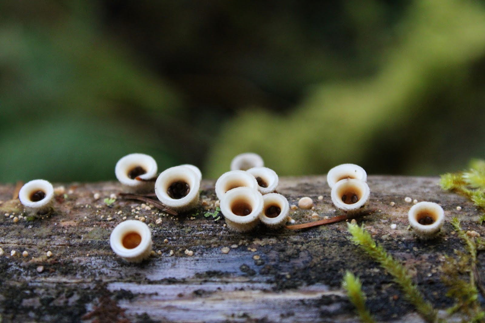 Roughly halfway between the upper and lower falls, the trail crossed over a small creek via a rustic wooden bridge covered with bird's nest fungus. Generally seen on the ground or on decaying twigs, these tiny fungi are actually shaped like a bird's nest, sometimes containing small brown "eggs" which actually are spore capsules. Because of their small size, these fungus are not readily spotted when we hike by them, but the bridge here was absolutely covered with the diminutive fungi and much macro-lens photography ensued.