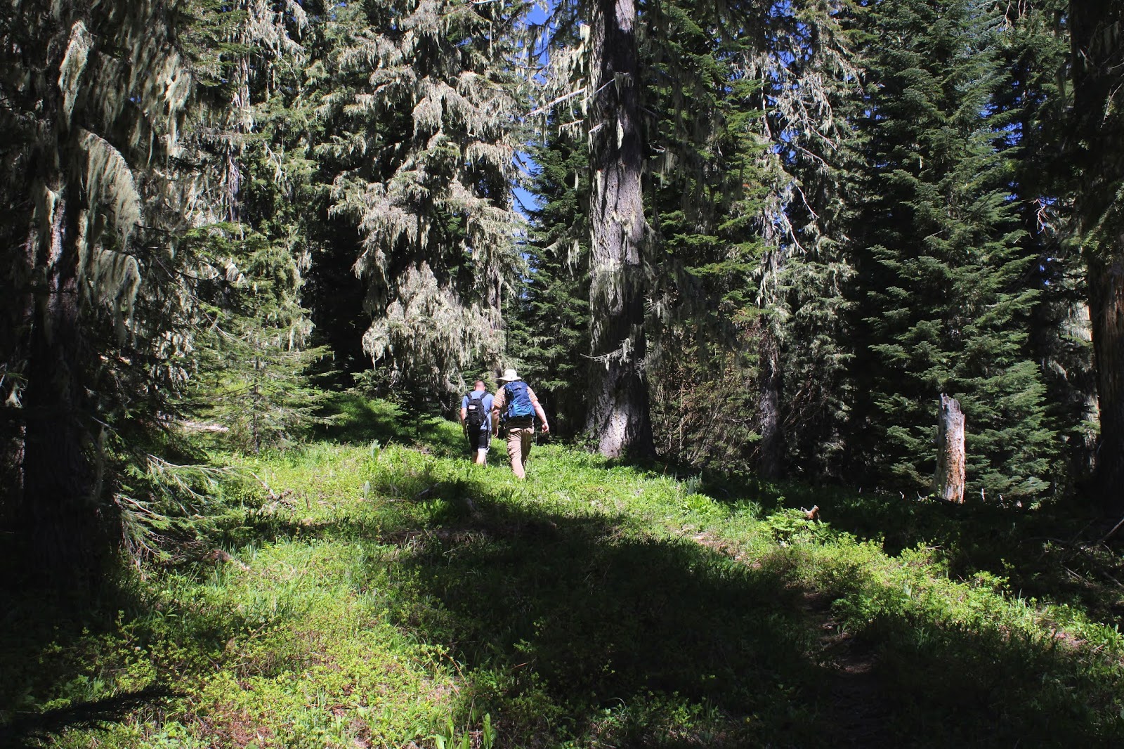 The aforementioned trail intersection was basically the highest elevation point of the hike and from here on in it was a steady descent through the famed meadows of the Yellow Jacket. Snow had mostly thawed out and just recently, so the meadows were as stubbly as a three-day beard on an unshaven chin. White-ish avalanche lilies and yellow glacier lilies flowered in the thawing snow's wake, aided and abetted by pink Oregon bleeding hearts and deep purple larkspurs. All of this reposed under a cobalt sky with views of the distant Cascades peaks. This is why we hike, boys and girls!